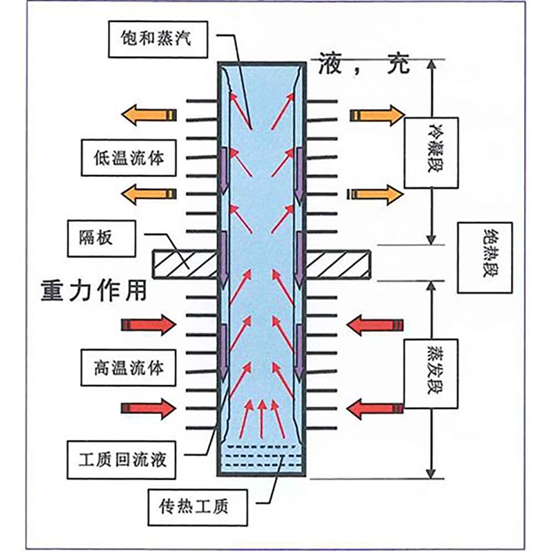 热管内蒸发段工质受热后将沸腾或蒸发,吸收外部 热源热量,产生汽化潜热,由液体变为蒸汽,产生的蒸汽在管内一定压差的 作用下,流到冷凝段,蒸汽遇冷壁面及外部冷源,凝结成液体,同时放出汽 化潜热,并通过管壁传给外部冷源,冷凝液靠重力(或吸液芯)作用下回流到蒸 发段再次蒸发。如此往复,实现对外部冷热两种介质的热量传递与交换。